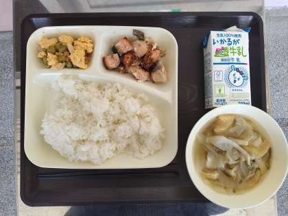 ご飯、牛乳、さけのごまみそ焼き、五目汁、えんどうの卵とじ
