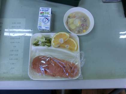 レーズンパン、牛乳、鶏肉とコーンのシチュー、キャベツときゅうりのサラダ、かわちばんかん