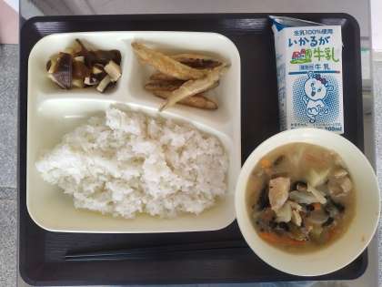 ご飯、牛乳、きびなごの天ぷら、みそ汁、わかたけ煮