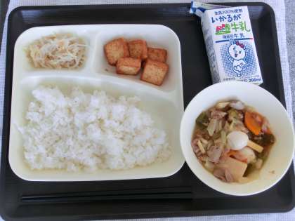 給食では、豚肉、うずら卵、キャベツ、たまねぎ、にんじん、た