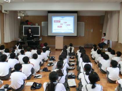 1年生を対象に、株式会社 明治 様にお越しいただき、熱中症に関する講話をしていただきました。1日に2.5リットルの水分補給(うち約半分は食事から摂取)する必要があること、運動直前の水分補給では遅く、朝食からしっかり水分を摂っておく必要があることなどをお話してもらいました。これからの暑い季節を安全に過ごすため、規則正しい食習慣、水分補給習慣を身に着けよう!
