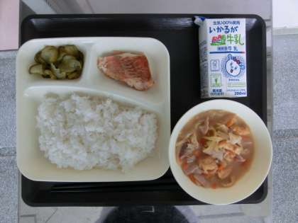 あかうおのしょうゆだれかけ 豚汁 きゅうりのゆず風味