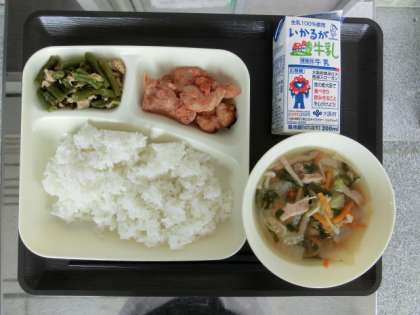 今日の給食では、鶏肉に、チリソースで下味を付けて焼いています。