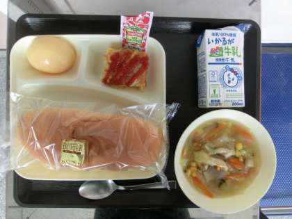 給食のオムレツは、卵、ツナ、じゃがいもを容器に入れて、焼