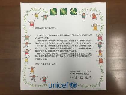 日本ユニセフ協会から感謝状が