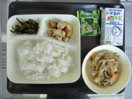 まぐろの甘辛焼き 豚汁 くきわかめのつくだ煮 まっ茶大豆
