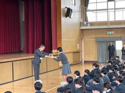 今日はグラウンドの状態が悪いので、体育館で集会をしました。校長先生からは、心のコップを上に向けて、1日1日の学習、努力がたまっていくようにしようとのお話しがありました。また、バレー部が大会表彰を受けました。
