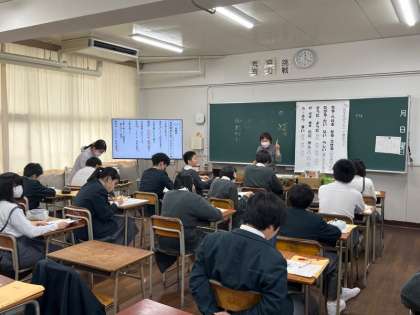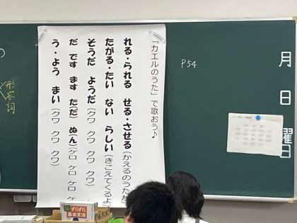 2年生の国語では少人数授業で文法を学んでいます。カエルの歌に合わせて、助動詞の学習中です!
