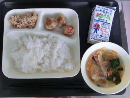 ツナともやしのいためもの ごはん 牛乳