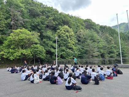 オリエンテーリング(登山)のスタートを前に、トイレを確認しています。登山が始まれば、トイレはしばらくありません。自然の中の厳しい環境に身を置くことで、水分補給やトイレを計画的にする必要がある。このように自分をコントロールすることも、中学校の一泊移住の目的です!成長しよう1年生!