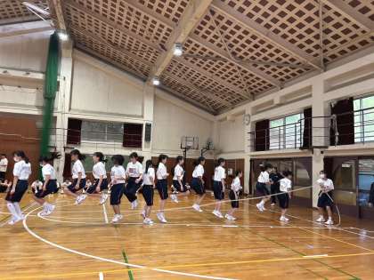 オリエンテーリングが無事終わり、水筒に水を補給したあと、大縄跳び大会を室内でしています。お天気は少し雨はあったものの、何とか持っています。登山の後で足が疲れている人もいますが、頑張ってジャンプしています!