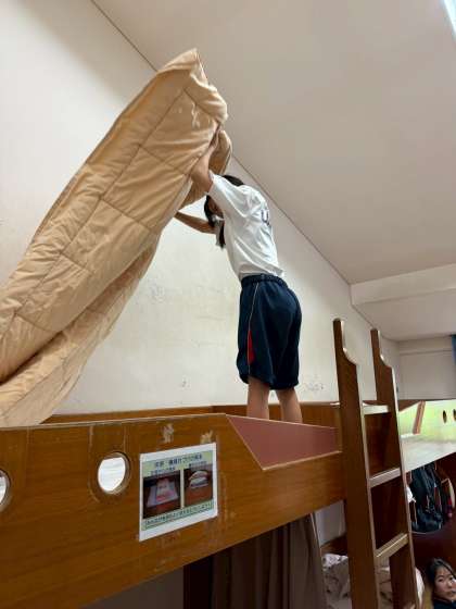 スタッフさんから、シーツのたたみ方の指導がありました。布団の上げ下げ、部屋の掃除など、完璧にしなくては、明日の朝の退室は不可です。