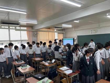 2年生の生物に授業のようすです。前の人から手を強く握られたら次の人の手を強く握ることで、神経伝達のスピードを学んでいます。このクラスでは、女子のグループの方が圧倒的に速かったようです。ガンバレ男子!