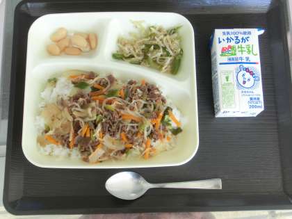 牛丼 もやしとピーマンのごまいため 大福豆の煮もの