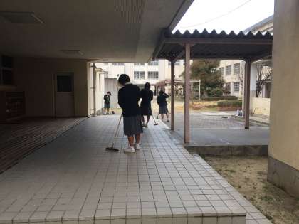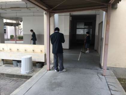 体育館まわりを清掃しています。