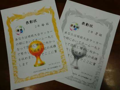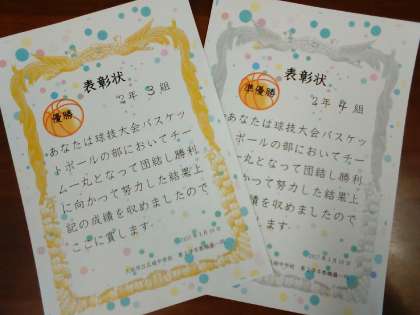 男子 サッカー 女子 バスケットボール 表彰状です。よく頑張りました。