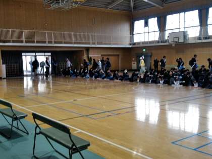 生徒は、自分の住む町会(ブロック)に分かれて体育館に