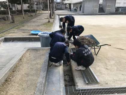 側溝の落ち葉をとったり、廊下の掃除・プール