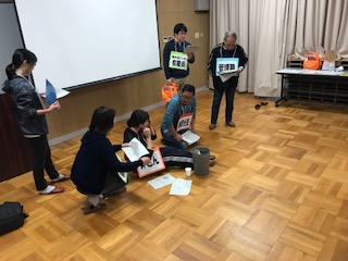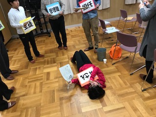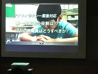最初、養護教諭の先生から説明があり、DVDで正しく対応するにはどうすれば良いかを学習しました。保健環境部の先生による模範演技の後、3班に分かれてシミュレーションを行いました。