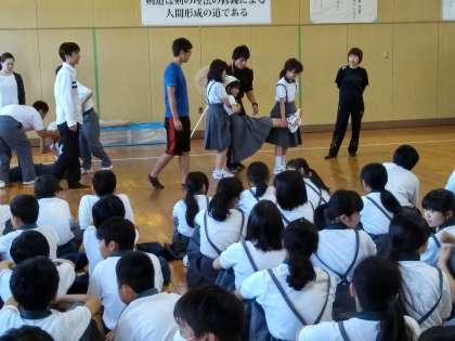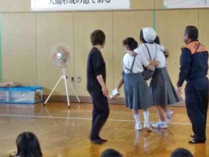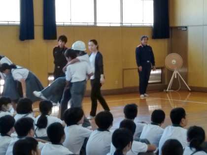 二人で肩を支えて立ったまま運ぶ訓練と、後ろから肩を支える人と