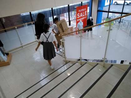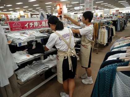 写真は、スーパーで、衣類の整理をする写真と段ボールの整理を任されて