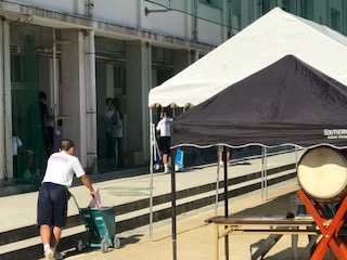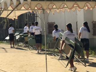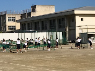 運動会の片付けだけでなく、台風に備えて、防球ネットを倒します。生徒の皆さんに感謝。