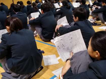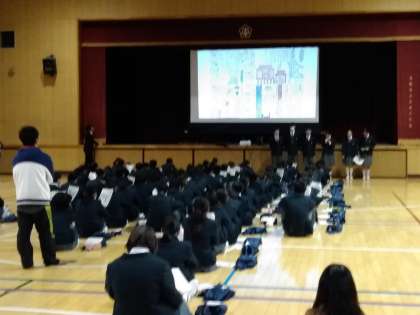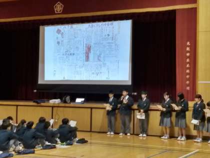 班が全体発表を行いました。2年生全員が体育館に集まって発表しま