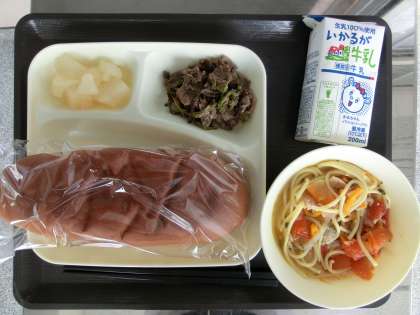 今日の給食では、旬の日本なし(和なし)を加工した缶詰を使用して