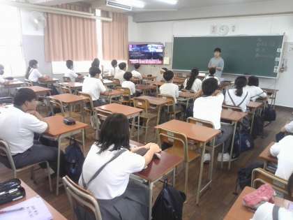 授業の最初に、10月に行く大阪・関西万博について、大阪メトロ中央線が休止したときのニュースをもとに、災害時の活動についてどのように過ごすかについてのお話がありました。