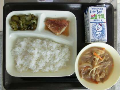 あかうおのしょうゆだれかけ 豚汁 きゅうりのゆず風味