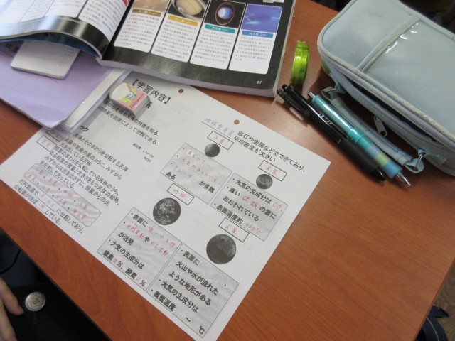 各惑星の特徴を学習しています。火星は表面が赤く、名前も「火」なのに気温はマイナスなんだ!と驚いている人がいました。月や火星への「移住計画」が最近話題になっていますが、そう遠くない将来、「ちょっと火星まで旅行に行ってきます」みたいな感じになるかも知れませんね。その時に備えて、しっかり惑星・衛星の勉強をしておきましょう!