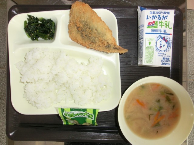 いわしフライ みそ汁 ほうれんそうのごま和え 抹茶大豆 ごはん 牛乳