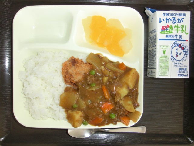カツカレーライス(米粉カツ) フルーツゼリー ごはん 牛乳