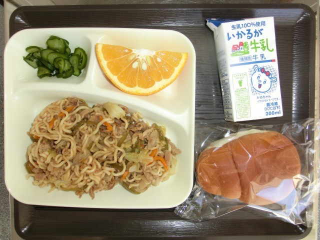 焼きそば きゅうりのしょうが漬け あまなつかん ミニコッペパン 牛乳