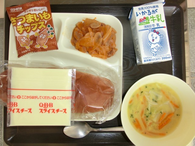 煮込みハンバーグ コーンスープ おさつチップス スライスチーズ 黒糖パン 牛乳