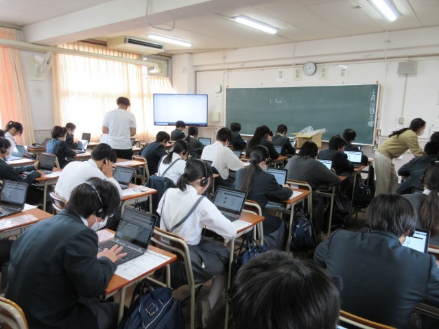 「きくこと(リスニング)」の調査のようすです。英語の学習を難しく感じている人は少なくありません。この画像にもヘッドセットが写っていますが、現在は言語習得のためにさまざまなツールが使用されています。これらを積極的に活用していきましょう。