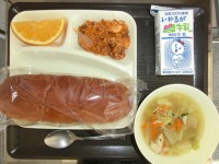 とうふのミートグラタン じゃがいもと野菜のスープ はっさく 黒糖パン 牛乳エネル...