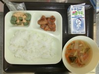 ヤンニョムチキン とうふのスープ 切り干し大根のナムル ごはん 牛乳エネルギー:...