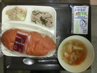豚肉のガーリック焼き スープ ツナとキャベツのソテー いちごジャムコッペパン 牛乳エネルギー:760kcal たんぱく質:39.5g 脂質:24.8g 糖質:85.5g『協力して安全に運ぼう!』 ・重...