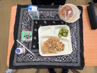 【焼きそば きゅうりのしょうがづけ 発酵乳 ソフト黒豆 黒糖パン 牛乳】