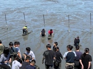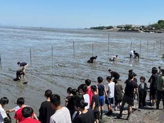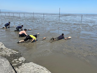 最初の競技はガタスキーです☆10人がチームになり干潟に立つポールをまわる競争です。スタート時から叫び声がこだましています♪