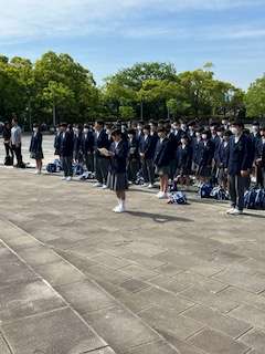 修学旅行☆平和公園セレモニー 公開日 2023/05/10 更新日 2023/05/10 お知らせ 平和記念公園記念像の前で平和記念セレモニーを行いました。代表生徒からは、被爆体験を継承することと平和を大切にすることを誓う言葉がありました。 いいね(0)