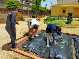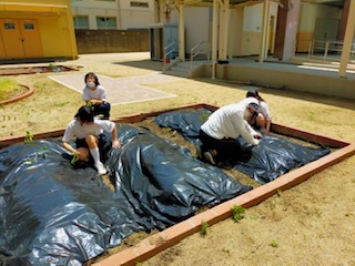 学校元気アップ本部事業コーディネーターの方にご協力いただき、校内の畑にスイカとサツマイモの苗を植えました☆