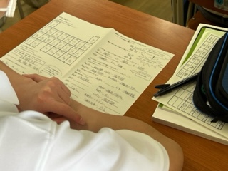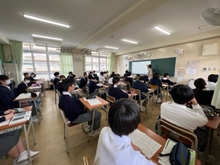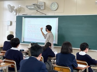 写真は、周期表を使い、原子の特徴について説明を聞いているところです。