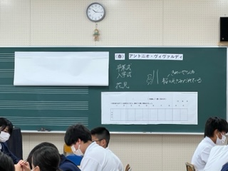 今日の授業☆1年生音楽科5月30日 公開日 2023/05/30 更新日 2023/05/30 お知らせ ヴィバルディの「春」について学習しました☆ 写真は、CDを聴き、同じ旋律だと思う小節に付箋を貼っているところです♪ いいね(0)