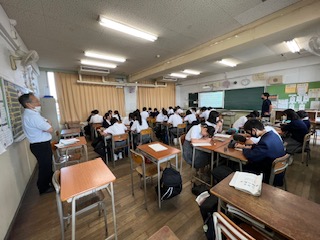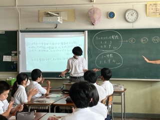研究授業☆2年生数学科6月29日 公開日 2023/06/29 更新日 2023/06/29 お知らせ 期末テストの振り返りの授業でした☆ 「式の計算」の中の証明問題に取り組みました。式の一つひとつの意味を全員がしっかりと理解しながら進められていました。数学が苦手な生徒には、リトルティーチャーが大活躍していました! いいね(0)