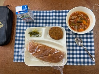 【チキンレバーカツ ケチャップ煮 おさつパン グリーンアスパラガスとキャベツのサラダ 牛乳】