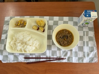 【マーボーなす ツナと野菜の炒めもの 米飯 焼きさつまいもの甘みつかけ 牛乳】