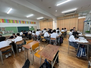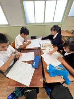 10月5日きら始まる中間テストに向け、前年度実施した2学期中間テストに挑戦しました☆分からないところかあればすぐに班の仲間が声をかけ、互いに協力してどんどん問題を解いといました♪