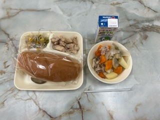 【鶏肉のガーリック焼き スープ煮 野菜のソテー コッペパン 牛乳】